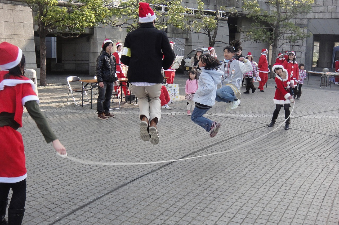 サンタがプレゼントを渡して交流、ゲーム大会、バンド演奏など